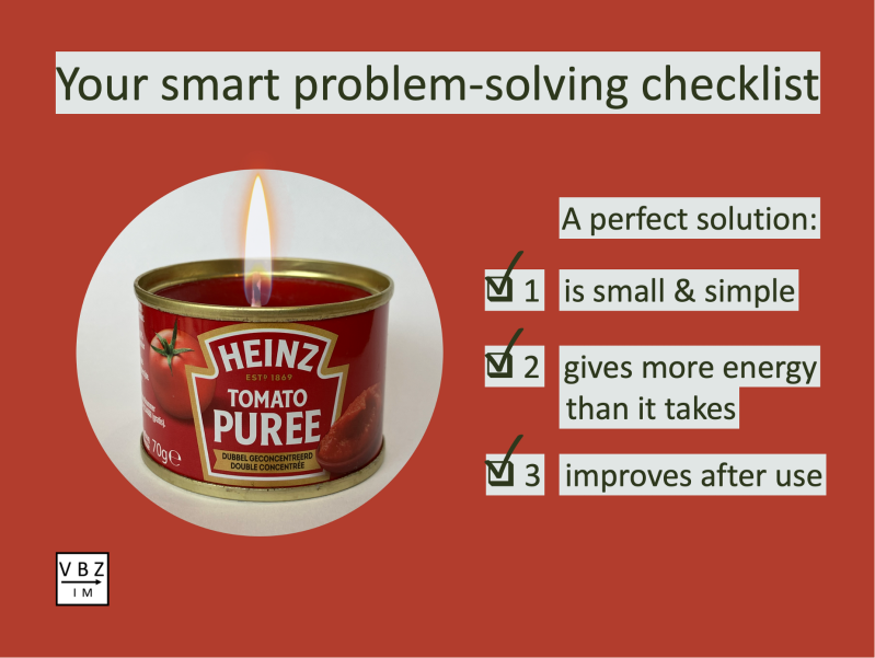 Hierboven beschreef ik hoe je tot de beste keuze van een oplossing kunt komen. Ik beschreef niet hoe je, daaraan voorafgaand, tot verschillende oplossingsrichtingen komt. Daarvoor bestaan heel veel (systematische) mogelijkheden waar ik misschien later nog eens aandacht aan besteed. Ter inspiratie deel ik wel graag de oplossing die mijn dochter (14) bedacht voor haar persoonlijke tekort aan spaarsaldo en het globale afvalprobleem: ze maakt kaarsen in afgeschreven blikjes, glazen en kopjes en verkoopt deze via een webshop. En daarmee checkt ze zo maar alle boxes voor een perfecte oplossing! Nieuwsgierig? Ga naar: https://duurzaamvonkje.wixsite.com/duurzaamvonkje.